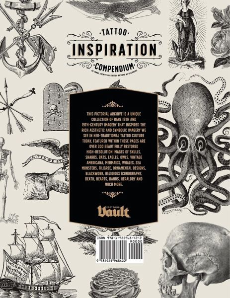 Are you a tattoo artist or designer looking for a comprehensive collection of rare, tattoo centric imagery for drawing references and tattoo flash designs? Alternatively, are you looking for inspiration for your next tattoo? If so, then this book is for you. This pictorial archive is a unique collection of rare 18th and 19th-century imagery that inspired the rich aesthetic and symbolic imagery we see in neo-traditional tattoo culture today. Featured within these pages are over 300 beautifully restored high-resolution images of skulls, sharks, bats, eagles, owls, vintage Americana, mermaids, whales, sea monsters, filigree, ornamental designs, blackwork, religious iconography, death, hearts, hands, heraldry and much more. Image Download Included: Each book comes with a unique download link providing instant access to high-resolution files of the hundreds of images featured. These images can be used in art and design projects, or printed and framed to make stunning decorative artworks for your home and office. When downloading your assets, you will also get access to the Vault Editions Skulls and Anatomy sample pack completely free. About the author: This book was curated and authored by the creative director of Vault Editions and Amazon best selling author Kale James. Kale has published over 12 acclaimed books within the art design space and has worked with brands including Nike, Samsung, Adidas and Rolling Stone. Kale's artwork is published in numerous titles including No Cure, Semi-Permanent, Vogue and more. Gain access to this collection today and start taking your tattoo designs to the next level.