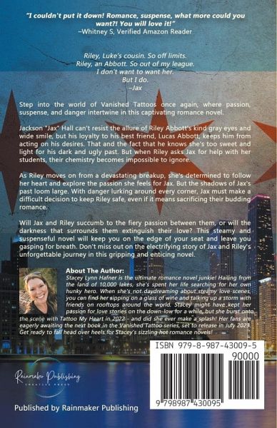 Get ready for the scorching hot 2nd installment of the thrilling VANISHED Series with Tattoo My Love! This steamy and suspenseful romance returns you to Vanished Tattoos, this time focusing on Jax, delivering an even more gripping and enticing storyline. Jackson "Jax" Hall can't resist the allure of Riley Abbott's kind gray eyes and wide smile, but his loyalty to his best friend, Lucas Abbott, keeps him from acting on his desires. However, when Riley asks Jax for help with her students, their chemistry becomes impossible to ignore. As Riley moves on from a devastating breakup, she's determined to follow her heart and explore the passion she feels for Jax. But when danger lurks around the corner, Jax must make a heart-wrenching decision to keep Riley safe, even if it means cutting himself out of her life entirely. Will Jax and Riley be able to resist the burning desire between them, or will their undeniable attraction consume them both?