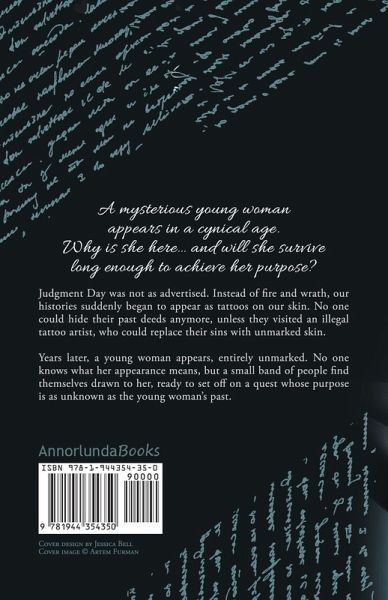 A mysterious young woman appears in a cynical age. Why is she here ... and will she survive long enough to achieve her purpose? Judgment Day was not as advertised. Instead of fire and wrath, our histories suddenly began to appear as tattoos on our skin. No one could hide their past deeds anymore, unless they visited an illegal tattoo artist, who could replace their sins with unmarked skin. Years later, a young woman appears, entirely unmarked. No one knows what her appearance means, but a small band of people find themselves drawn to her, ready to set off on a quest whose purpose is as unknown as the young woman's past.