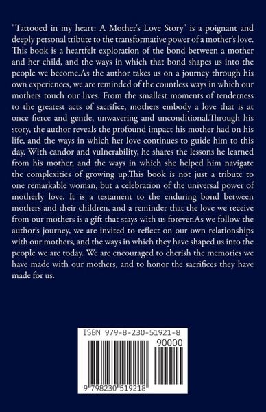 "Tattooed in my heart: A Mother's Love Story" is a poignant and deeply personal tribute to the transformative power of a mother's love. This book is a heartfelt exploration of the bond between a mother and her child, and the ways in which that bond shapes us into the people we become.As the author takes us on a journey through his own experiences, we are reminded of the countless ways in which our mothers touch our lives. From the smallest moments of tenderness to the greatest acts of sacrifice, mothers embody a love that is at once fierce and gentle, unwavering and unconditional.Through his story, the author reveals the profound impact his mother had on his life, and the ways in which her love continues to guide him to this day. With candor and vulnerability, he shares the lessons he learned from his mother, and the ways in which she helped him navigate the complexities of growing up.This book is not just a tribute to one remarkable woman, but a celebration of the universal power of motherly love. It is a testament to the enduring bond between mothers and their children, and a reminder that the love we receive from our mothers is a gift that stays with us forever.As we follow the author's journey, we are invited to reflect on our own relationships with our mothers, and the ways in which they have shaped us into the people we are today. We are encouraged to cherish the memories we have made with our mothers, and to honor the sacrifices they have made for us.