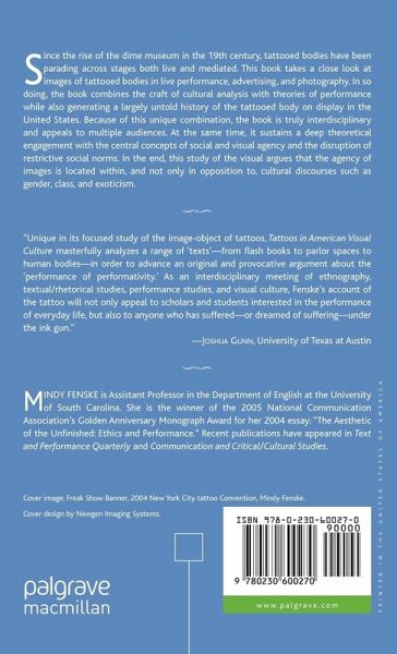 "Unique in its focused study of the image-object of tattoos, Tattoos in American Visual Culture masterfully analyzes a range of texts - from flash books to parlor spaces to human bodies - in order to advance an original and provocative argument about the performance of performativity. As an interdisciplinary meeting of ethnography, textual/rhetorical studies, performance studies, and visual culture, Fenske's account of the tattoo will not only appeal to scholars and students interested in the performance of everyday life, but also to anyone who has suffered - or dreamed of suffering - under the ink gun." - Joshua Gunn, University of Texas at Austin