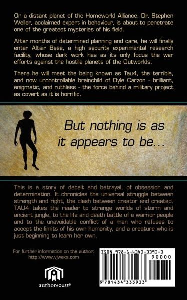 Award Winner! San Francisco Book Festival Awards, 2nd Place, Science Fiction On a distant planet of the Homeworld Alliance, Dr. Stephen Weller, acclaimed expert in behaviour, is about to penetrate one of the great mysteries of his field. After months of determined planning and care, he will finally enter Altair Base, a high security experimental research facility, whose dark work has as its only focus the war efforts against the hostile planets of the Outworlds. There he will meet the being known as Tau 4, the terrible, and now uncontrollable brainchild of Dyle Carzon ¿ brilliant, enigmatic, and ruthless ¿ the force behind a military project that has traveled a shadowed and increasingly bloody path from medical miracle to the edge of horrific destruction. But Weller is not what he appears to be. This is a story of deceit and betrayal, of obsession and determination. It chronicles the universal struggle between strength and right, the clash between creator and created. TAU 4 takes the reader to strange worlds of storm and ancient jungle, to the life and death battle of a warrior people and to the unavoidable conflict of a man who refuses to accept the limits of his own humanity, and a creature who is just beginning to learn her own.
