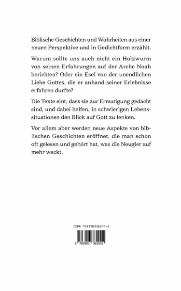 Biblische Geschichten und Wahrheiten aus einer neuen Perspektive und in Gedichtform erzählt. Warum sollte uns auch nicht ein Holzwurm von seinen Erfahrungen auf der Arche Noah berichten? Oder ein Esel von der unendlichen Liebe Gottes, die er anhand seiner Erlebnisse erfahren durfte? Die Texte eint, dass sie zur Ermutigung gedacht sind, und dabei helfen, in schwierigen Lebenssituationen den Blick auf Gott zu lenken. Vor allem aber werden neue Aspekte von biblischen Geschichten eröffnet, die man schon oft gelesen und gehört hat, was die Neugier auf mehr weckt.