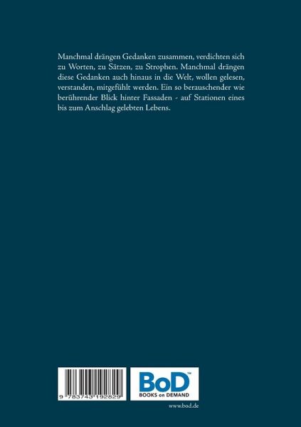 Manchmal drängen Gedanken zusammen, verdichten sich zu Worten, zu Sätzen, zu Strophen. Manchmal drängen diese Gedanken auch hinaus in die Welt, wollen gelesen, verstanden, mitgefühlt werden. Ein so berauschender wie berührender Blick hinter Fassaden - auf Stationen eines bis zum Anschlag gelebten Lebens.