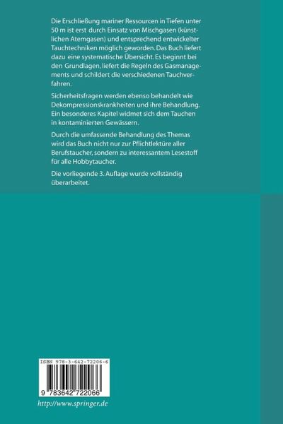 Die Erschließung mariner Ressourcen in Tiefen unter 50m ist erst durch Einsatz von Mischgasen (künstlichen Atemgasen) und entsprechend entwickelter Tauchtechniken möglich geworden. Das Buch liefert dazu eine systematische Übersicht. Es beginnt bei den Grundlagen, liefert die Regeln des Gasmanagements und schildert die verschiedenen Tauchverfahren. Sicherheitsfragen werden ebenso behandelt wie Dekompressionskrankheiten und ihre Behandlung. Ein besonderes Kapitel widmet sich dem Tauchen in kontaminierten Gewässern. Durch die umfassende Behandlung des Themas wird das Buch nicht nur zur Pflichtlektüre aller Berufstaucher, sondern zu interessantem Lesestoff für alle Hobbytaucher. Die vorliegende 3. Auflage wurde vollständig überarbeitet.