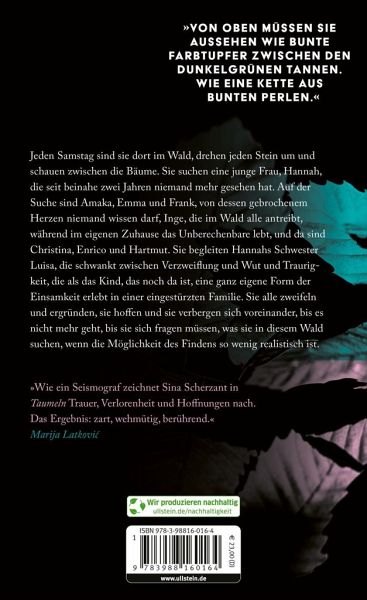 Taumeln taucht sensibel, furchtlos und fein beobachtend in die Leben derjenigen ein, die das Suchen nicht aufgeben. Hunderte Suchende waren es mal, jetzt sind da nur noch Frank, von dessen gebrochenem Herzen niemand wissen darf, Inge, die im Wald alle antreibt, während im eigenen Zuhause das Unberechenbare lebt, Amaka, die versucht, einen diffusen Phantomschmerz abzuschütteln, da sind Emma, Enrico, Christina und Hartmut. Und da ist die Schwester, Luisa, die schwankt zwischen Verzweiflung und Wut und Traurigkeit, die als das Kind, das noch da ist, eine ganz eigene Form der Einsamkeit erlebt in einer eingestürzten Familie. Sie alle zweifeln und ergründen, sie hoffen und sie verbergen sichvoreinander, bis es nicht mehr geht, bis sie sich fragen müssen, was sie in diesem Wald suchen, wenn die Möglichkeit des Findens so wenig realistisch ist.