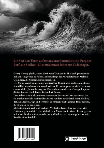 Ein von den Toten auferstandener Journalist, ein Prepperdorf, ein Stalker -alles zusammen führt zu Todesangst.In einer Tiefgarage sieht Georg Herzog zufällig einen alten Bekannten - aber der ist doch 2004 beim Tsunami in Thailand gestorben? Georg weiß genau, was er gesehen hat und beauftragt die Privatdetektivin Melanie Gramberg nachzuforschen.Melanie kommt dem Vermissten auf die Spur, doch dann verschwindet der unter mysteriösen Umständen und Melanie ist nicht die Einzige, die nach ihm sucht. Unter seinen Verfolgern sind auch ein Unternehmer aus Bayern und eine Gruppe Prepper, die ein Feriendorf im Taunus bewirtschaften.Melanie hat den Verdacht, dass es um etwas viel Größeres als nur einen verschwundenen Urlauber geht, doch die neue Staatsanwältin scheint ihr zu misstrauen, sie sogar zu verdächtigen. Und dann taucht auch noch ein Stalker auf, der Melanie und ihre Familie bedroht!Melanies Ermittlungen werden zu einem Wettlauf mit der Zeit.Der Kriminalroman spielt in Bad Homburg und dem Taunus.
