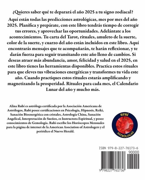 ¿Quieres saber qué te deparará el año 2025 a tu signo zodiacal? Aquí están todas las predicciones astrológicas, mes por mes del año 2025. Planifica y prepárate, con este libro tendrás tiempo de corregir tus errores, y aprovechar las oportunidades. Adelántate a los acontecimientos. Tu carta del Tarot, rituales, amuleto de la suerte, color de la suerte, y cuarzo del año están incluidos en este libro. Aquí encontrarás mensajes que te acompañarán, te harán reflexionar, y te darán fuerza para seguir transitando este año lleno de cambios. Si deseas atraer más abundancia, amor, felicidad y salud en el 2025, en este libro tienes las herramientas disponibles. Practica estos rituales para que eleves tus vibraciones energéticas y transformes tu vida este año. Cuando practiques estos rituales estarás amplificando y magnetizando la prosperidad. Rituales para cada mes, el Calendario Lunar del año y mucho más.
