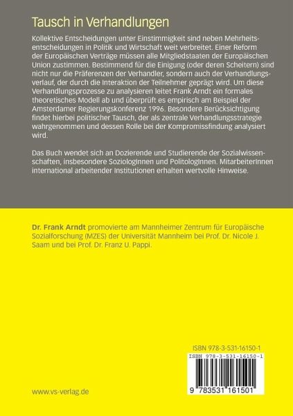 Kollektive Entscheidungen unter Einstimmigkeit sind neben Mehrheitsentscheidungen in Politik und Wirtschaft weit verbreitet. Einer Reform der Europäischen Verträge müssen alle Mitgliedstaaten der Europäischen Union zustimmen. Bestimmend für die Einigung (oder deren Scheitern) sind nicht nur die Präferenzen der Verhandler, sondern auch der Verhandlungsverlauf, der durch die Interaktion der Teilnehmer geprägt wird. Um diese Verhandlungsprozesse zu analysieren leitet Frank Arndt ein formales theoretisches Modell ab und überprüft es empirisch am Beispiel der Amsterdamer Regierungskonferenz 1996. Besondere Berücksichtigung findet hierbei politischer Tausch, der als zentrale Verhandlungsstrategie wahrgenommen und dessen Rolle bei der Kompromissfindung analysiert wird.