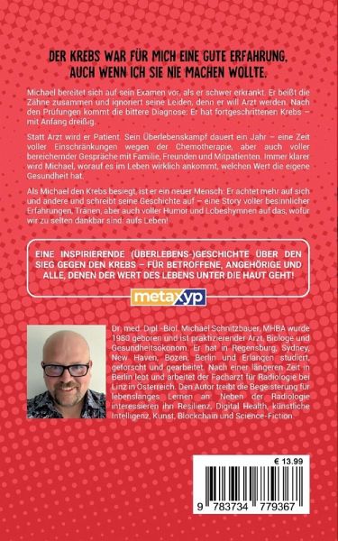 »DER KREBS WAR FÜR MICH EINE GUTE ERFAHRUNG, AUCH WENN ICH SIE NIE MACHEN WOLLTE.«Michael bereitet sich auf sein Examen vor, als er schwer erkrankt. Er beißt die Zähne zusammen und ignoriert seine Leiden, denn er will Arzt werden. Nach den Prüfungen kommt die bittere Diagnose: Er hat fortgeschrittenen Krebs - mit Anfang dreißig.Statt Arzt wird er Patient. Sein Überlebenskampf dauert ein Jahr - eine Zeit voller Einschränkungen wegen der Chemotherapie, aber auch voller bereichernder Gespräche mit Familie, Freunden und Mitpatienten. Immer klarer wird Michael, worauf es im Leben wirklich ankommt, welchen Wert die eigene Gesundheit hat.Als Michael den Krebs besiegt, ist er ein neuer Mensch: Er achtet mehr auf sich und andere und schreibt seine Geschichte auf - eine Story voller besinnlicher Erfahrungen, Tränen, aber auch voller Humor und Lobeshymnen auf das, wofür wir zu selten dankbar sind: aufs Leben! Eine inspirierende (Überlebens-)Geschichte über den Sieg gegen den Krebs - für Betroffene, Angehörige und alle, denen der Wert des Lebens unter die Haut geht!