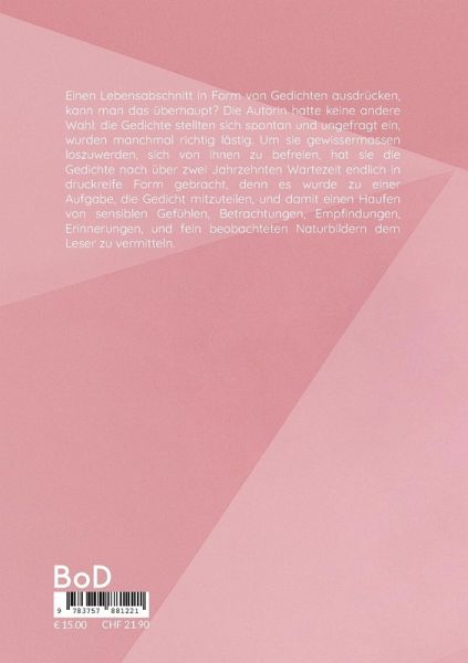 Einen Lebensabschnitt in Form von Gedichten ausdrücken: kann man das überhaupt? Die Autorin hatte keine andere Wahl: die Gedichte stellten sich spontan und ungefragt ein, wurden manchmal richtig lästig. Um sie gewissermassen loszuwerden, sich von ihnen zu befreien, hat sie die Gedichte nach über zwei Jahrzehnten Wartezeit endlich in druckreife Form gebracht, denn es wurde zu einer Aufgabe, die Gedicht mitzuteilen, und damit einen Haufen von sensiblen Gefühlen, Betrachtungen, Empfindungen, Erinnerungen, und fein beobachteten Naturbildern dem Leser zu vermitteln.