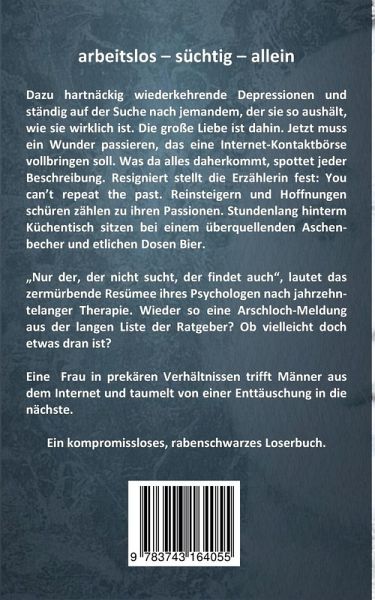 arbeitslos - süchtig - alleinDazu hartnäckig wiederkehrende Depressionen und ständig auf der Suche nach jemandem, der sie so aushält, wie sie wirklich ist. Die große Liebe ist dahin. Jetzt muss ein Wunder passieren, das eine Internet-Kontaktbörse vollbringen soll. Was da alles daherkommt, spottet jeder Beschreibung. Resigniert stellt die Erzählerin fest: You can't repeat the past. Reinsteigern und Hoffnungen schüren zählen zu ihren Passionen. Stundenlang hinterm Küchentisch sitzen bei einem überquellenden Aschenbecher und etlichen Dosen Bier."Nur der, der nicht sucht, der findet auch", lautet das zermürbende Resümee ihres Psychologen nach jahrzehntelanger Therapie. Wieder so eine Arschloch-Meldung aus der langen Liste der Ratgeber? Ob vielleicht doch etwas dran ist?Eine Frau in prekären Verhältnissen trifft Männer aus dem Internet und taumelt von einer Enttäuschung in die nächste.Ein kompromissloses, rabenschwarzes Loserbuch.