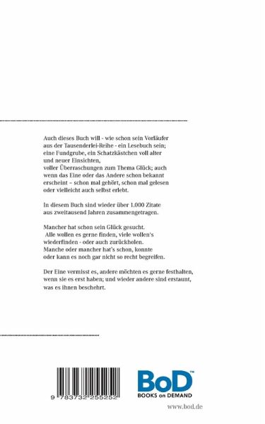 Auch dieses Buch will wie schon sein Vorgänger ein Lesebuch sein; eine Fundgrube, ein Schatzkästchen voll alter und neuer Einsichten, voller Überraschungen zum Thema Glück; auch wenn das Eine oder das Andere schon bekannt erscheint - schon mal gehört, schon mal gelesen oder vielleicht auch selbst erlebt.In diesem Buch sind wieder über 1.000 Aphorismen, Weisheiten und Zitate aus zwei Jahrtausenden verzeichnet.Mancher hat schon sein Glück gesucht, andere haben's versucht. Manche wollen's gerne finden, andere wieder finden - oder auch zurückholen. Manche oder mancher hat's schon, konnte oder kann es noch gar nicht so recht begreifen. Der Eine vermisst es, andere möchten es gerne festhalten, wenn sie es erst haben; und wieder andere sind erstaunt, was es ihnen beschehrt.