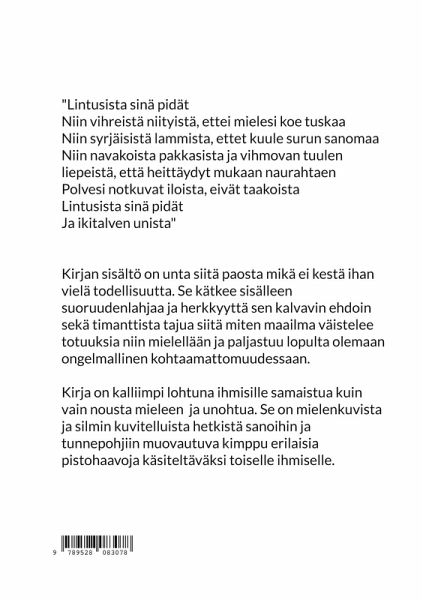 Kirjan sisältö on unta siitä paosta mikä ei kestä ihan vielä todellisuutta. Se kätkee sisälleen suoruudenlahjaa, herkkyyttä sen kalvavin ehdoin ja timanttista tajua siitä miten maailma väistelee totuuksia niin mielellään ja paljastuu lopulta olemaan ongelmallinen kohtaamattomuudessaan. Kirja on kalliimpi lohtuna ihmisille samaistua kuin terävänä ja kärkevänä tulla ihmisen mieleen ja unohtua. Se on mielenkuvista ja silmin kuvitellusta hetkestä sanoihin ja tunnepohjiin muovautuva kimppu erilaisia pistohaavoja käsiteltäviksi tuokioiksi toiselle ihmiselle.