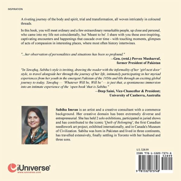 A riveting journey of the body and spirit, trial and transformation, all woven intricately in coloured threads. In this book, you will meet ordinary and a few extraordinary remarkable people, up close and personal, who came into my life not coincidentally, but 'Meant to be'. I share with you these awe-inspiring, captivating encounters and happenings that cascade over time - with touching moments, glimpses of acts of compassion in interesting places, where most often history intertwines. "...her observation of personalities and situations has been so profound." -Gen. (retd.) Pervez Musharraf, former President of Pakistan "In Tawafuq, Sabiha's style is inviting, drawing the reader with the informality of her 'girl next door' style, to travel alongside her through the journey of her life, intimately participating in her myriad experiences from her youth in the emergent Pakistan of the 1950s and 60s through an exciting global journey to today. Tawafuq - 'Whatever Will be, Will be' - is just that, a spontaneous immersion into an intimate experience of the 'open book' that is Sabiha." -Deep Saini, Vice-Chancellor & President; University of Canberra, Australia