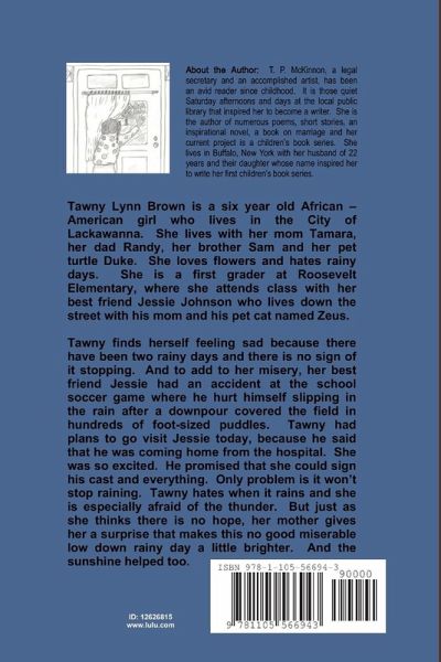 Tawny finds herself feeling sad because there have been two rainy days and there is no sign of it stopping. And to add to her misery, her best friend Jessie had an accident at the school soccer game where he hurt himself slipping in the rain after a downpour covered the field in hundreds of foot-sized puddles. Tawny had plans to go visit Jessie today, because he said that he was coming home from the hospital. She was so excited. He promised that she could sign his cast and everything. Only problem is it won't stop raining. Tawny hates when it rains and she is especially afraid of the thunder. But just as she thinks there is no hope, her mother gives her a surprise that makes this no good miserable low down rainy day a little brighter. And the sunshine helped too.