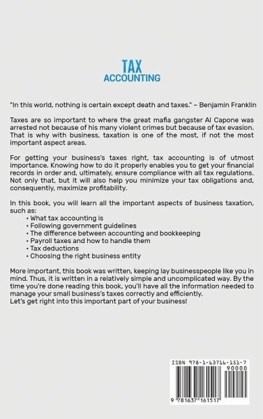 If you're a business owner wanting to learn more about taxes without going through boring textbooks, then keep reading... Benjamin Franklin once said that "in life, only two things are certain: death and taxes." He wasn't exaggerating about the latter. And because you must deal with taxes for as long as you live and earn money, you must get it right every time. Unlike any other infractions or violations, tax-related offenses have major repercussions. At a minimum, you will pay fines and expenses. But if your tax violations are serious, you may end up in jail. Think about this: the infamous mafia gangster boss Al Capone was indicted and sent to prison not because of his violent crimes, but because of tax violations. Hence, you must take your taxes very seriously. So, what does it take to manage your taxes successfully and avoid the massive inconveniences associated with being flagged by the Internal Revenue Service for tax violations? There are so many answers to this question, but they can be summed up in one term: tax accounting. And that is what this book is all about. Written with non-accountant entrepreneurs in mind, this book can help you learn important tax accounting principles for ensuring optimal tax management in your business. These include:What tax accounting is. Important tax accounting guidelines. The difference between accounting and bookkeeping. How to claim tax deductions legally. How to choose the right business entity. How to manage payroll tax. Discover if you need an S corporation or a C corporation. And much, much more! By the time you're finished with this book, you'll be armed with sufficient knowledge to ensure proper management of your businesses' income taxes. And while you can never avoid taxes, what you'll learn here can make you and the IRS the best of friends. So, grab your copy of this book now and start your journey towards optimal tax management for your small business.