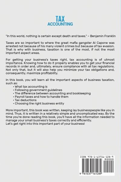 If you're a business owner wanting to learn more about taxes without going through boring textbooks, then keep reading... Benjamin Franklin once said that "in life, only two things are certain: death and taxes." He wasn't exaggerating about the latter. And because you must deal with taxes for as long as you live and earn money, you must get it right every time. Unlike any other infractions or violations, tax-related offenses have major repercussions. At a minimum, you will pay fines and expenses. But if your tax violations are serious, you may end up in jail. Think about this: the infamous mafia gangster boss Al Capone was indicted and sent to prison not because of his violent crimes, but because of tax violations. Hence, you must take your taxes very seriously. So, what does it take to manage your taxes successfully and avoid the massive inconveniences associated with being flagged by the Internal Revenue Service for tax violations? There are so many answers to this question, but they can be summed up in one term: tax accounting. And that is what this book is all about. Written with non-accountant entrepreneurs in mind, this book can help you learn important tax accounting principles for ensuring optimal tax management in your business. These include:What tax accounting is. Important tax accounting guidelines. The difference between accounting and bookkeeping. How to claim tax deductions legally. How to choose the right business entity. How to manage payroll tax. Discover if you need an S corporation or a C corporation. And much, much more! By the time you're finished with this book, you'll be armed with sufficient knowledge to ensure proper management of your businesses' income taxes. And while you can never avoid taxes, what you'll learn here can make you and the IRS the best of friends. So, grab your copy of this book now and start your journey towards optimal tax management for your small business.