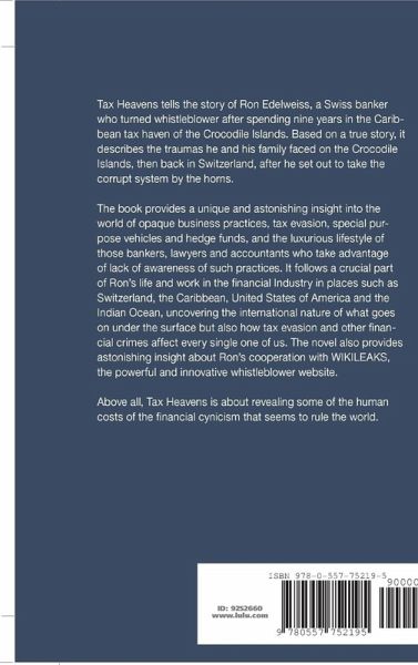 Tax Heavens tells the story of Ron Edelweiss, a Swiss banker who turned whistleblower after spending nine years in the Caribbean tax haven of the Crocodile Islands. Based on a true story, it describes the traumas he and his family faced on the Crocodile Islands, then back in Switzerland, after he set out to take the corrupt system by the horns with the help of WIKILEAKS. The book provides a unique and astonishing insight into the world of opaque business practices in Offshore Centers and the luxurious lifestyle of those bankers, lawyers and accountants. Above all, Tax Heavens is about revealing some of the human costs of the financial cynicism that seems to rule the world.