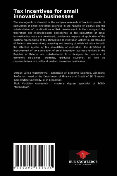 The monograph is devoted to the complex research of tax instruments of stimulation of small innovation business in the Republic of Belarus and the substantiation of the directions of their development. In the monograph the theoretical and methodological approaches to tax stimulation of small innovation business are developed; problematic aspects of application of the existing mechanisms of tax stimulation of innovation activity in the Republic of Belarus are determined; revealing and leveling of which will allow to build the effective system of tax stimulation of innovation; the directions of improvement of tax stimulation of small innovation business entities in the Republic of Belarus are substantiated. It is designed for teachers of economic disciplines, students, graduate students, as well as representatives of small and medium innovative businesses.