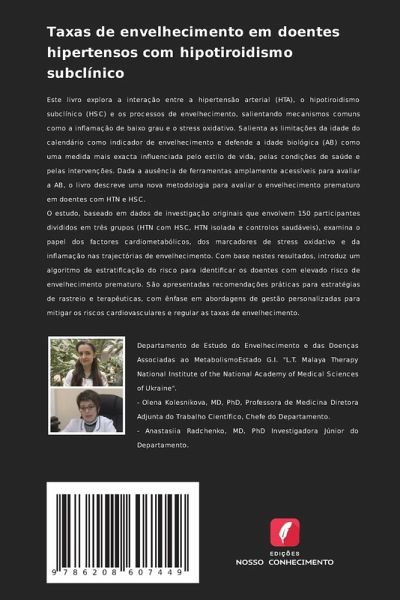 Este livro explora a interação entre a hipertensão arterial (HTA), o hipotiroidismo subclínico (HSC) e os processos de envelhecimento, salientando mecanismos comuns como a inflamação de baixo grau e o stress oxidativo. Salienta as limitações da idade do calendário como indicador de envelhecimento e defende a idade biológica (AB) como uma medida mais exacta influenciada pelo estilo de vida, pelas condições de saúde e pelas intervenções. Dada a ausência de ferramentas amplamente acessíveis para avaliar a AB, o livro descreve uma nova metodologia para avaliar o envelhecimento prematuro em doentes com HTN e HSC.O estudo, baseado em dados de investigação originais que envolvem 150 participantes divididos em três grupos (HTN com HSC, HTN isolada e controlos saudáveis), examina o papel dos factores cardiometabólicos, dos marcadores de stress oxidativo e da inflamação nas trajectórias de envelhecimento. Com base nestes resultados, introduz um algoritmo de estratificação do risco para identificar os doentes com elevado risco de envelhecimento prematuro. São apresentadas recomendações práticas para estratégias de rastreio e terapêuticas, com ênfase em abordagens de gestão personalizadas para mitigar os riscos cardiovasculares e regular as taxas de envelhecimento.