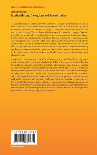 Tax practitioners are unfamiliar with tax theory. Tax economists remain unfamiliar with tax law and tax administration. Most textbooks relate mainly to the US, UK or European experiences. Students in emerging economies remain unfamiliar with their own taxation history. This textbook fills those gaps. It covers the concept of taxes in regards to their rationale, principles, design, and common errors. It addresses distortions in consumer choices and production decisions caused by tax and redressals. The main principles of taxation-efficiency, equity, stabilization, revenue productivity, administrative feasibility, international neutrality-are presented and discussed. The efficiency principle requires the minimisation of distortions in the market caused by tax. Equity in taxation is another principle that is maintained through progressivity in the tax structure. Similarly, other principles have their own ramifications that are also addressed.