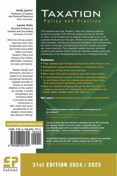 Fully updated each year, Taxation: Policy and Practice continues to provide coverage of the UK's tax system as it has for 31 years. The most widely used UK University tax textbook! It is an excellent aid to support a first course in tax, or as a general introduction to this topic. Written in an accessible style with many examples, activities and questions throughout, this textbook gives the reader a thorough understanding of the UK's taxation principles and current practices. The companion website provides additional questions and answers, links to other tax materials available online and commentary on tax developments as they occur throughout the year. While the UK tax system becomes ever more complicated and many text books and guides reflect this trend, Taxation: Policy and Practice 2024/2025 edition, maintains its clarity and brevity. Reader friendly and informative, this text is based on a structured conceptual framework. Updated annually to ensure an accurate reflection of the current tax climate, it avoids unnecessary and confusing detail. It provides an ideal introduction to both macro and micro perspectives of UK taxation, fiscal policy and decision making. FeaturesFully updated and revised to include the Finance Act 2024 Designed to support independent or classroom study. A glossary of key terms and concepts. More than 100 useful questions and mini case studies. A comprehensive package of further materials available for purchasers from the website including many extra exam and practice questions, with answers. Ideal for students studying UK tax for the first time for a degree course or for professional tax examinations for ACCA, CIMA, ICAEW, ICAS, CIPFA, ATT etc.
