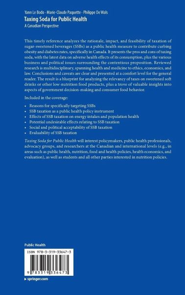 This timely reference analyzes the rationale, impact, and feasibility of taxation of sugar-sweetened beverages (SSBs) as a public health measure to contribute curbing obesity and diabetes rates, specifically in Canada. It presents the pros and cons of taxing soda, with the latest data on adverse health effects of its consumption, plus the various business and political issues surrounding the contentious proposition. Reviewed research is multidisciplinary, spanning health and medicine to ethics, economics, and law. Conclusions and caveats are clear and presented at a comfort level for the general reader. The result is a blueprint for analyzing the relevancy of taxes on sweetened soft drinks or other low-nutrition food products, plus a trove of valuable insights into aspects of government decision-making and consumer food behavior.