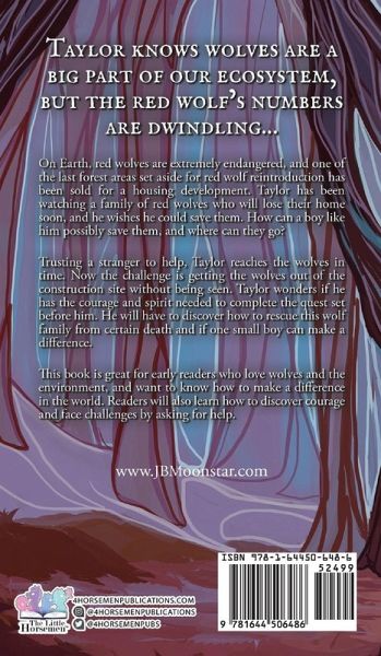 Can one small boy save a family of red wolves? On Earth, red wolves are extremely endangered, and one of the last forest areas set aside for red wolf reintroduction has been sold for a housing development. Taylor has been watching a family of red wolves who will lose their home, and he wishes he could save them, but how could he save them and where could they go? What can one person do to change the world? Trusting a stranger to help, Taylor manages to reach the wolves in time, but now he faces a new problem: how can they get the wolves out of the construction site without being seen? With such impossible odds, Taylor wonders if he has the courage and spirit needed to complete the quest and rescue this wolf family from certain death and if one small boy can make a difference. This book includes information about red wolves.