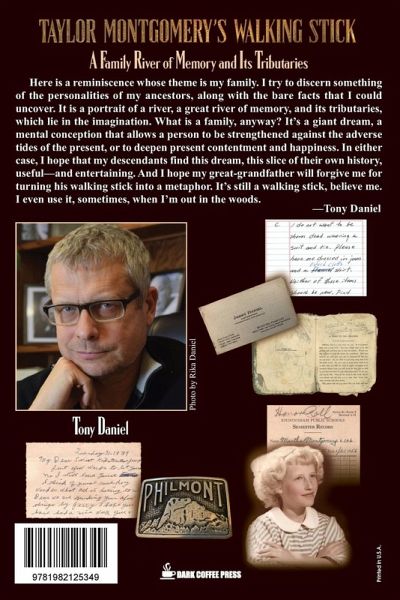 Here is a reminiscence whose theme is my family. I try to discern something of the personalities of my ancestors, along with the bare facts that I could uncover. It is a portrait of a river, a great river of memory, and its tributaries, which lie in the imagination. What is a family, anyway? It's a giant dream, a mental conception that allows a person to be strengthened against the adverse tides of the present, or to deepen present contentment and happiness. In either case, I hope my descendants will find this dream, this slice of their own history, useful and entertaining. And I hope my great-grandfather will forgive me for turning his walking stick into a metaphor. It's still a walking stick, believe me. I even use it, sometimes, when I'm out in the woods.