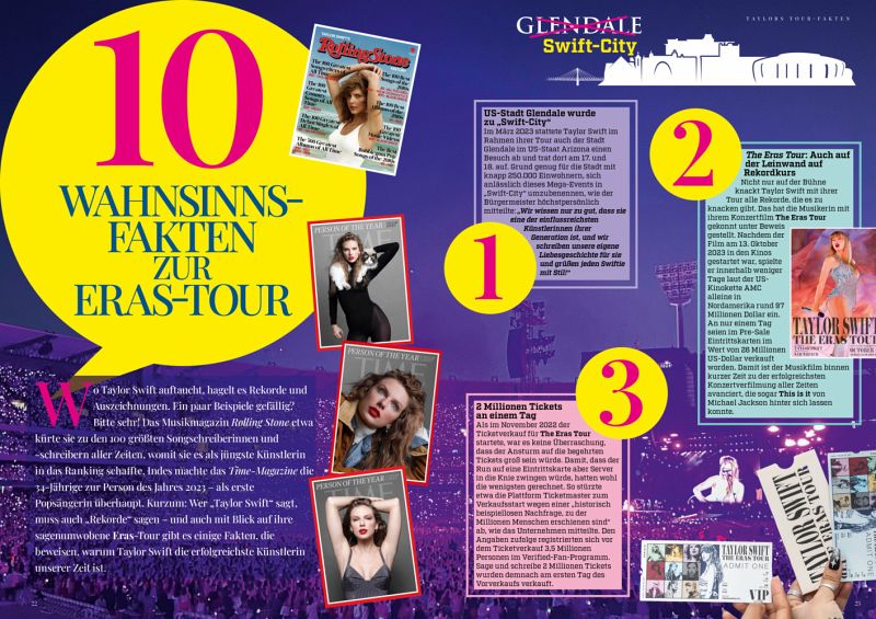 Taylors LooksIn welchen Designer-Looks glänzt Superstar Taylor Swift auf dem Roten Teppich? Wie oft wechselt siewährend eines Konzertes im Rahmen ihrer weltweiten The Eras-Tour das Outfit? Und wie ist sie in denvergangenen Jahren eigentlich zu jener Stilikone avanciert, die sie heute ist? Als Singer-Songwriterin und Live-Performerin auf den größten Bühnen dieser Welt bricht Taylor Swift einen Rekord nach demnächsten. Dabei ist es nicht nur die musikalische Inszenierung, die die Auftritte der 34-Jährigen zu dem Highlight machen, die sie sind. Denn zum Phänomen Taylor Swift gehören auch ihre ikonischen Looks, in denen sie sich immer wieder präsentiert - sowohl live on stage als auch auf dem Roten Teppich. Bei den weltweit ausverkauften Auftritten durchlebt sie vor Zehntausenden Swifties ihre musikalischen Eras und krönt ihre Hits wie Lover, Anti-Hero oder Red neben einer beeindruckenden Bühnenshow mit imposanten Outfits, die den Charakter jeder Ära passend untermalen und ihren Fansein unvergessliches Konzerterlebnis bescheren. Von einzigartigen Red-Carpet-Looks bei prestigeträchtigen Events wie den Grammys oder den MTVMusic Awards bis hin zu ihrer legendären Bühnen- und Outfit-Show im Rahmen der Eras-Tour - auf 114starken Seiten bildet "ShowTops" ein ultimatives Best-of-Taylor-Swift ab und bietet Swifties damit ein eininzigartiges Fan-Nachschlagewerk. Neben Taylors besten Looks präsentiert das Bookazine außerdem diekrassesten Fakten rund um die Eras-Tour, eine XXL-Analyse, wie Taylor Swift zu der Ikone unserer Zeit werden konnte und beantwortet unter anderem die Frage, welche Google-Suchanfragen Nutzerinnen und Nutzer rund um ihre Lieblingssängerin stellen.
