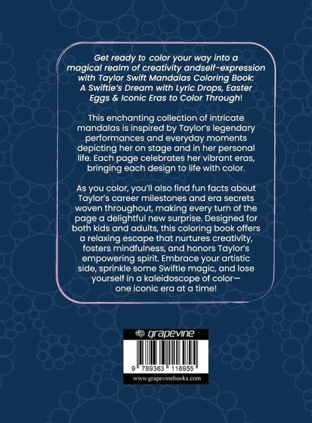 Get ready to color your way into a magical realm of creativity and self-expression! Taylor Swift Mandalas Coloring Book: A Swiftie's Dream with Lyric Drops, Easter Eggs & Iconic Eras to Color Through! This enchanting collection of intricate mandalas is inspired by Taylor's legendary performances and everyday moments-depicting her on stage and in her personal life. Each page celebrates her vibrant eras, bringing each design to life with color. As you color, you'll also find fun facts about Taylor's career milestones and era secrets woven throughout, making every turn of the page a delightful new surprise. Designed for both kids and adults, this coloring book offers a relaxing escape that nurtures creativity, fosters mindfulness, and honors Taylor's empowering spirit. Embrace your artistic side, sprinkle some Swiftie magic, and lose yourself in a kaleidoscope of color-one iconic era at a time!