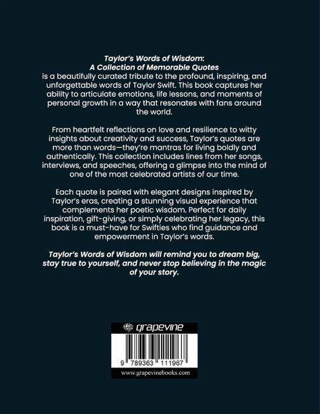 Taylor's Words of Wisdom: A Collection of Memorable Quotes is a beautifully curated tribute to the profound, inspiring, and unforgettable words of Taylor Swift. This book captures her ability to articulate emotions, life lessons, and moments of personal growth in a way that resonates with fans around the world. From heartfelt reflections on love and resilience to witty insights about creativity and success, Taylor's quotes are more than words-they're mantras for living boldly and authentically. This collection includes lines from her songs, interviews, and speeches, offering a glimpse into the mind of one of the most celebrated artists of our time. Each quote is paired with elegant designs inspired by Taylor's eras, creating a stunning visual experience that complements her poetic wisdom. Perfect for daily inspiration, gift-giving, or simply celebrating her legacy, this book is a must-have for Swifties who find guidance and empowerment in Taylor's words. Taylor's Words of Wisdom will remind you to dream big, stay true to yourself, and never stop believing in the magic of your story.