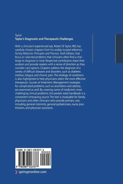 Primary care physicians in the U.S. and abroad widely trust and use Dr. Robert Taylor's acclaimed "Family Medicine: Principles and Practice, 6/E". This derivative handbook capitalizes on that success to address clinical problems that pose diagnostic and therapeutic challenges for primary care physicians. Chapters cover the diagnosis of a multitude of difficult diseases and disorders, including diabetes mellitus, fatigue, and chronic pain. The etiology of the conditions is also highlighted to help physicians select the most effective therapeutic courses of treatment. Contributors to the text include some of the most prestigious names in the field.