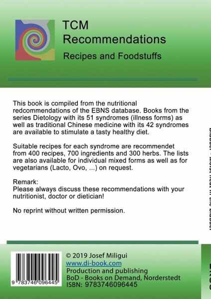di-book - nutritional counseling after TCM syndromes - Diet recommendations, recipes and food supplements for supporting the therapy. The recipes help you to cook tasty dishes. All recipes with cooking instructions, calorie indications and description of the effect. The foods are shown in categories recommended, yes, little and no and help you to orientate if your own recipes should be cooked.