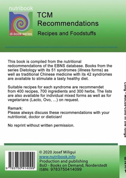 nutribook - nutritional counseling after TCM syndromes - Diet recommendations, recipes and food supplements for supporting the therapy. The recipes help you to cook tasty dishes. All recipes with cooking instructions, calorie indications and description of the effect. The foods are shown in categories recommended, yes, little and no and help you to orientate if your own recipes should be cooked.