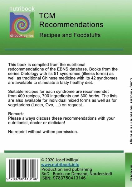 di-book - nutritional counseling after TCM syndromes - Diet recommendations, recipes and food supplements for supporting the therapy. The recipes help you to cook tasty dishes. All recipes with cooking instructions, calorie indications and description of the effect. The foods are shown in categories recommended, yes, little and no and help you to orientate if your own recipes should be cooked.