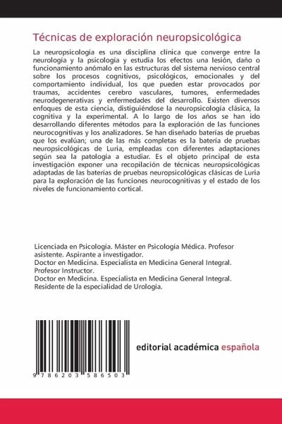 La neuropsicología es una disciplina clínica que converge entre la neurología y la psicología y estudia los efectos una lesión, daño o funcionamiento anómalo en las estructuras del sistema nervioso central sobre los procesos cognitivos, psicológicos, emocionales y del comportamiento individual, los que pueden estar provocados por traumas, accidentes cerebro vasculares, tumores, enfermedades neurodegenerativas y enfermedades del desarrollo. Existen diversos enfoques de esta ciencia, distiguiéndose la neuropsicología clásica, la cognitiva y la experimental. A lo largo de los años se han ido desarrollando diferentes métodos para la exploración de las funciones neurocognitivas y los analizadores. Se han diseñado baterías de pruebas que los evalúan; una de las más completas es la batería de pruebas neuropsicológicas de Luria, empleadas con diferentes adaptaciones según sea la patología a estudiar. Es el objeto principal de esta investigación exponer una recopilación de técnicas neuropsicológicas adaptadas de las baterías de pruebas neuropsicológicas clásicas de Luria para la exploración de las funciones neurocognitivas y el estado de los niveles de funcionamiento cortical.