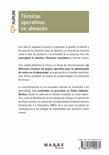 Este libro le ayudará a conocer y optimizar la gestión, el diseño y los usos de los distintos tipos de almacén, en función de factores como el tipo de producto o la actividad de la empresa. Con ello conseguirá la máxima eficiencia económica y ahorrar costos. Esta unidad didáctica le ofrece, en fichas de microformación, las diferentes técnicas de mejora operativa para la optimización de costos en el almacenaje: la negociación y el cambio operativo, esta última mediante la mejora de productividad y la reducción de errores. La microformación es un innovador sistema de formación y de aprendizaje. Los contenidos se presentan en fichas independientes, donde en cada una se aborda y resuelve un tema específico, como la distribución de los equipos de trabajo y la gestión de los flujos internos, la mejora de la productividad mediante diversas técnicas (las 5 S, Pomodoro, SMED, etc.), así como los planes de contingencia y los códigos de trazabilidad que permiten evitar errores.
