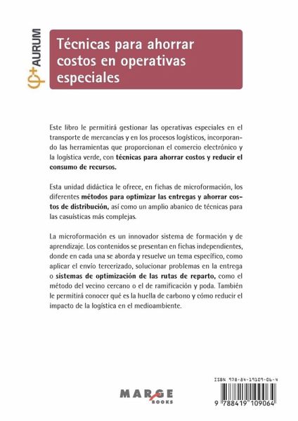 Este libro le permitirá gestionar las operativas especiales en el transporte de mercancías y en los procesos logísticos, incorporando las herramientas que proporcionan el comercio electrónico y la logística verde, con técnicas para ahorrar costos y reducir el consumo de recursos. Esta unidad didáctica le ofrece, en fichas de microformación, los diferentes métodos para optimizar las entregas y ahorrar costos de distribución, así como un amplio abanico de técnicas para las casuísticas más complejas. La microformación es un innovador sistema de formación y de aprendizaje. Los contenidos se presentan en fichas independientes, donde en cada una se aborda y resuelve un tema específico, como aplicar el envío tercerizado, solucionar problemas en la entrega o sistemas de optimización de las rutas de reparto, como el método del vecino cercano o el de ramificación y poda. También le permitirá conocer qué es la huella de carbono y cómo reducir el impacto de la logística en el medioambiente.