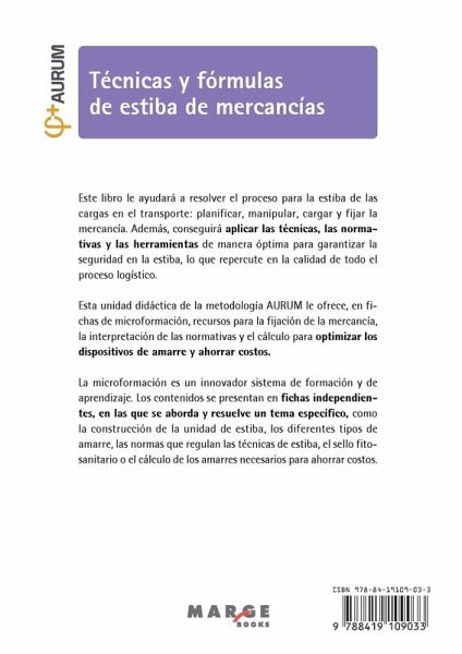 Este libro le ayudará a resolver el proceso para la estiba de las cargas en el transporte: planificar, manipular, cargar y fijar la mercancía. Además, conseguirá aplicar las técnicas, las normativas y las herramientas de manera óptima para garantizar la seguridad en la estiba, lo que repercute en la calidad de todo el proceso logístico. Esta unidad didáctica de la metodología AURUM le ofrece, en fichas de microformación, recursos para la fijación de la mercancía, la interpretación de las normativas y el cálculo para optimizar los dispositivos de amarre y ahorrar costos. La microformación es un innovador sistema de formación y de aprendizaje. Los contenidos se presentan en fichas independientes, en las que se aborda y resuelve un tema específico, como la construcción de la unidad de estiba, los diferentes tipos de amarre, las normas que regulan las técnicas de estiba, el sello fitosanitario o el cálculo de los amarres necesarios para ahorrar costos.
