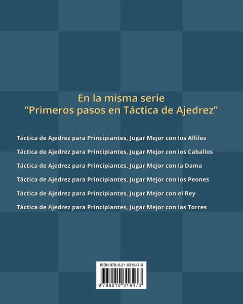 Para progresar, una vez asimiladas las normas, es necesario adquirir puntos de referencia sólidos. En particular, debe conocer bien los puntos fuertes y débiles de cada pieza. Para ello, hay que practicar. Hay que practicar con problemas de ajedrez bien elegidos, como los de este libro. Este volumen se centra en el Rey En este libro de gran formato, encontrará: * 500 ejercicios con sus soluciones al final de la página, * ejercicios en los que el Rey juega un papel importante (3/4 de las jugadas en promedio), * ejercicios progresivos para avanzar sobre bases sólidas, perfectos para los principiantes, * ejercicios de Mate en 1 a Mate en 5 y a veces más (y sí, incluso un principiante puede resolver Mat en 5, siempre que estén bien dirigidos). ¿Qué pasa después? Una vez que haya resuelto estos 500 problemas de ajedrez, comprenderá mejor los puntos fuertes y débiles del Rey. Sabrá cómo explotarlos. A continuación, será el momento de abordar la táctica y sus principales temas, como el tenedor, la clavada, la enfilada, el doble ataque o la desviación. Cada día, unos cuantos problemas de ajedrez ... y, día tras día, semana tras semana, las sutilezas de cada pieza se harán evidentes. Poco a poco, su sentido táctico se agudizará. Así, podrá infligir importantes daños a sus oponentes. Esta serie "Primeros pasos en Táctica de Ajedrez" consta de 6 volúmenes independientes que pueden consultarse en cualquier orden: * Táctica de Ajedrez para Principiantes, Jugar Mejor con los Alfiles, * Táctica de Ajedrez para Principiantes, Jugar Mejor con los Caballos, * Táctica de Ajedrez para Principiantes, Jugar Mejor con la Dama, * Táctica de Ajedrez para Principiantes, Jugar Mejor con los Peones, * Táctica de Ajedrez para Principiantes, Jugar Mejor con el Rey, * Táctica de Ajedrez para Principiantes, Jugar Mejor con las Torres.