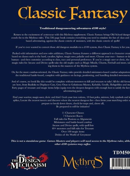Traditional dungeoneering adventures d100 style! Return to the excitement of yesteryear with this Mythras supplement. Classic Fantasy brings Old School dungeon crawls the to the Mythras rules. This 336 page book contains everything you need to emulate the fun of class and level based adventuring, against the classic coterie of monsters, with the classic coterie of spells! If you've ever wanted to convert those old dungeon modules to a d100 system, then Classic Fantasy is for you. Packed with information and new rules additions, Classic Fantasy features a different approach to character creation based on classes such as the bard, cavalier, fighter, magic-user, paladin and more. Choose your race - human or demihuman - and then customise according to class, race and personal preference. If you're a magic user or cleric, the new magic rules for Arcane and Divine spells take the old staples such as Magic Missile, Charm, Fireball and more, tailoring them to the nuances of the Mythras system. Or, for the more combat-oriented, the Classic Fantasy rules provide detailed miniatures-based combat adaptations for the traditional battle-board, complete with guidance on facings, positioning, and handling detailed movement. And of course, no book like this would be complete without monsters to kill and treasure to take! All the old favourites are here, from Basilisks to Displacer Cats, Grey Ooze to Gelatinous Masses, Kobolds, Gnolls, Hobgoblins and more. Forty pages of treasure and magic items helps equip even the deepest dungeon with enough loot to satisfy the keenest adventuring party. Find your warrior, magic-user, cleric and thief. Grab your iron rations, 10 foot poles, mirrors, holy symbols and iron spikes, Locate the nearest tavern and discover where the nearest dungeon lies - then form your marching order and prepare to break down doors, check for traps and, above all, Be prepared to roll for initiative! 11 Character Classes 7 Character Races Full rules for Passions as Alignments Miniatures and battle-board combat Arcane and Divine spells, with spell lists 40+ monsters and full rules for Treasure Over 100 magic items Deities of the World of Greymoor This is not a standalone game. Games Masters and players will need access to the Mythras rules, although other d100 systems may suffice.
