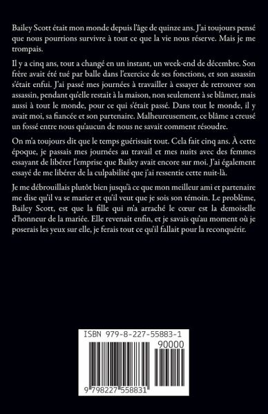 Bailey Scott était mon monde depuis l'âge de quinze ans. J'ai toujours pensé que nous pourrions survivre à tout ce que la vie nous réserve. Mais je me trompais. Il y a cinq ans, tout a changé en un instant, un week-end de décembre. Son frère avait été tué par balle dans l'exercice de ses fonctions, et son assassin s'était enfui. J'ai passé mes journées à travailler à essayer de retrouver son assassin, pendant qu'elle restait à la maison, non seulement à se blâmer, mais aussi à tout le monde, pour ce qui s'était passé. Dans tout le monde, il y avait moi, sa fiancée et son partenaire. Malheureusement, ce blâme a creusé un fossé entre nous qu'aucun de nous ne savait comment résoudre. On m'a toujours dit que le temps guérissait tout. Cela fait cinq ans. À cette époque, je passais mes journées au travail et mes nuits avec des femmes essayant de libérer l'emprise que Bailey avait encore sur moi. J'ai également essayé de me libérer de la culpabilité que j'ai ressentie cette nuit-là. Je me débrouillais plutôt bien jusqu'à ce que mon meilleur ami et partenaire me dise qu'il va se marier et qu'il veut que je sois son témoin. Le problème, Bailey Scott, est que la fille qui m'a arraché le c¿ur est la demoiselle d'honneur de la mariée. Elle revenait enfin, et je savais qu'au moment où je poserais les yeux sur elle, je ferais tout ce qu'il fallait pour la reconquérir.