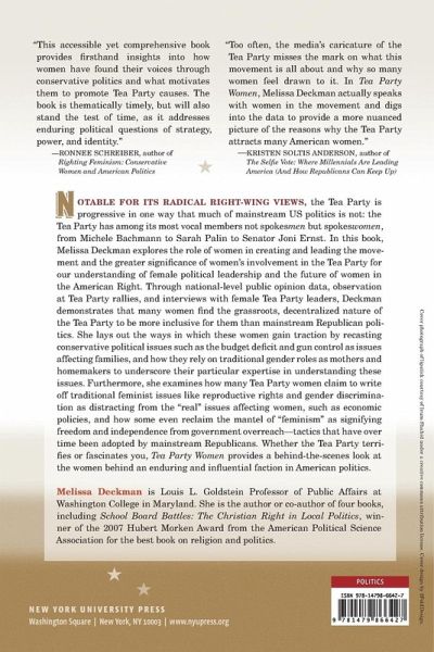 Examines the significant role of women in the conservative movement Notable for its radical conservative views, the Tea Party is progressive in one way that much of mainstream US politics is not: it has among its most vocal members not spokesmen but spokeswomen. Michelle Bachmann, Sarah Palin, Governor Nikki Haley, US Representative Cathy McMorris Rodgers, and many others are all prominent figureheads for the fiery and prominent political movement. Many major Tea Party organizations, such as the Tea Party Patriots, are led by women and women have been instrumental in founding new right wing organizations for women, such as Smart Girl Politics, with ties to the movement. In Tea Party Women, Melissa Deckman explores the role of women in creating and leading the movement and the greater significance of women's involvement in the Tea Party for our understanding of female political leadership and the future of women in the American Right. Through national-level public opinion data, observation at Tea Party rallies, and interviews with female Tea Party leaders, Deckman demonstrates that many Tea Party women find the grassroots, decentralized nature of the movement to be more inclusive for them than mainstream Republican politics. She lays out the ways in which these women gain traction by recasting conservative political issues such as the deficit and gun control as issues affecting families, and how they rely on traditional gender roles as mothers and homemakers to underscore their particular expertise in understanding these issues. Furthermore, she examines how many Tea Party women claim to write off traditional feminist issues like reproductive rights and gender discrimination as distracting from the real issues affecting women, such as economic policies, and how some even reclaim the mantel of 'feminism' as signifying freedom and independence from government overreach-tactics that have over time been adopted by mainstream Republicans. Whether the Tea Party terrifies or fascinates you, Tea Party Women provides a behind-the-scenes look at the women behind an enduring and influential faction in American politics.