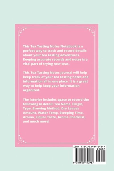 This Tea Tasting Notes Journal is a perfect way to keep track of all your tea tasting adventures. Rate and review the teas you try. Each interior page features prompts and space for writing the following: Tea - Record the Name, Brand & Seller. Origin - Write the country origin. Type - Log whether it is Black, White, Green, Herbal, Oolong, Pu-erh, Fruit, or Other. Brewing Method - Record details of the brewing method used. Dry Leaves Amount - Write how many leaves were used. Water Temp - Log the temperature. Steeping Time - Record the amount of time it was steeped. Aroma - Write anything you notice about the aroma. Liquor Taste - Did you have any liquor taste? Aroma Checklist - Check whether it was Bitter, Robust, Nutty, Spicy, Woodsy, Smokey, Earthy, Citrus, Flowery, Delicate, Sweet, Malty or Other. Prepared With - Write whether you used Sugar, Cream, Milk, Lemon, Honey or Other. Where Purchased - Record where did you purchase the tea. Notes - Blank lined space for journaling any important information such as ideas, favorite flavors you want to remember, varieties you want to try, Would You Buy Again? - Check yes or no. Rating - Log your rating from 1-5 stars. Can also make a great gift idea for that special person in your life who is a tea lover and loves to try different teas. Size is 6x9 inches, 100 pages, soft matte finish cover, white paper, black ink, paperback. Simple and easy to use. Get your copy today! Enjoy!