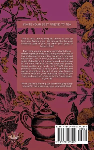 INVITE YOUR BEST FRIEND TO TEA! Time to relax, time to be quiet, time to sit and sip from your favorite china cup--tea time will be the most important part of your day when your guest of honor is God! Each time you draw away to unwind with these refreshing devotionals you'll find gentle touches of love and comfort, moments of beauty, and renewed enthusiasm. Part of the Quiet Moments With God series of devotionals, the easy-to-read meditations in Tea Time With God include scriptures, poems, stories, quotes, and much more. They'll give you precious moments to refocus your priorities and gather strength for the rest of your day. Troubles will melt away, and you'll rediscover healing for your hurts and soothing remedies for the frayed edges of your life. While the tea is brewing, you can thoroughly steep yourself in the presence of your very best Friend. And after you try just one of these relaxing and edifying devotions, you'll want to make these quiet times a regular part of your daily agenda. Go ahead and put the kettle on!