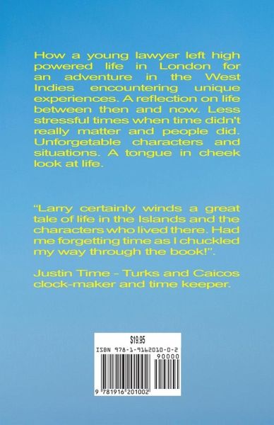 How a young lawyer left high powered life in London for an adventure in the West Indies encountering unique experiences. A reflection on life between then and now. Less stressful times when time didn't really matter and people did.Unforgetable characters and situations. A tongue in cheek look at life.