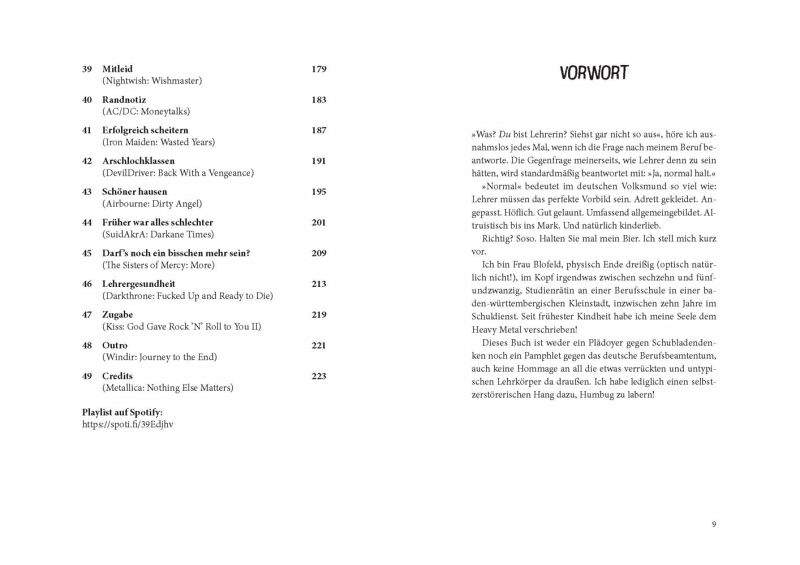 Lehrer müssen das perfekte Vorbild sein, adrett gekleidet, angepasst, höflich, umfassend allgemeingebildet und natürlich kinderlieb? Nicht unbedingt! Die Studienrätin Caro Blofeld hat sich seit frühester Jugend dem Heavy Metal verschrieben, liebt triviale Literatur, Filme, Serien und Computerspiele. Großflächig tätowiert und generell in schwarz gekleidet, fällt sie mit ihrer unverblümten, nicht immer pädagogisch korrekten Art aus dem üblichen Rahmen. Von ihren Schülern wird sie geschätzt - und erreicht bei ihnen oft mehr als andere. In ihrem Buch zeigt sie, wie man in unserem eingefahrenen Schulsystem auf unkonventionelle Art und Weise Schüler begeistern und Dinge verändern kann. Mal lustig, mal explizit kritisch und provokant, immer ehrlich und mit einem ordentlichen Schuss Selbstironie erzählt sie von ihrem ständig überraschenden, manchmal bizarren, auf jeden Fall niemals langweiligen Berufsalltag. Selbstredend, dass dabei auch Kritik an eingefahrenen Lehrmethoden, überehrgeizigen Eltern, dem deutschen Schulsystem oder dem Berufsbeamtentum nicht zu kurz kommen.