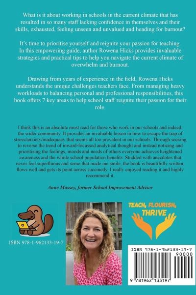 Break free from teacher burnout in 7 simple steps. Struggling with overwhelm? Exhaustion? Close to burnout. Learn small, actionable steps to find energy, fulfillment and thrive as a teacher. If you are an overwhelmed, drained teacher, Teach, Flourish, Thrive offers strategies, tools and research based evidence to enable teachers to move from survival to thriving. Rowena Hicks, an experienced teacher, trainer and leader reveals practical, tried and tested keys that will teach you exactly how to rebuild your confidence, creativity and your love for your teaching role. If you are working in a school, running on empty with little or no work life balance, you are not alone! The school system is broken. By having a fresh outlook, having goals and taking some control back in your day, realising your impact and your strengths, you can flourish and thrive again in your role. Time to banish burnout! Learn how to:See the impact of investing in yourself Prevent burnout from happening Take small, achievable action to rediscover the best version of yourself Become a more effective member of your team ¿¿Become more productive, energetic and ultimately more happy Teach, Flourish, Thrive will re-shape the way you approach your day, your colleagues, the children, your family and especially yourself. It will give you the strategies and tools you need to transform your feelings of survival to thriving: from burnout to flourishing. Whether you are a staff member seeking ways to be able to stay in school and overcome the feelings of burnout, or a school leader looking for ways to re-energise, encourage and empower your team, this is the book for you!
